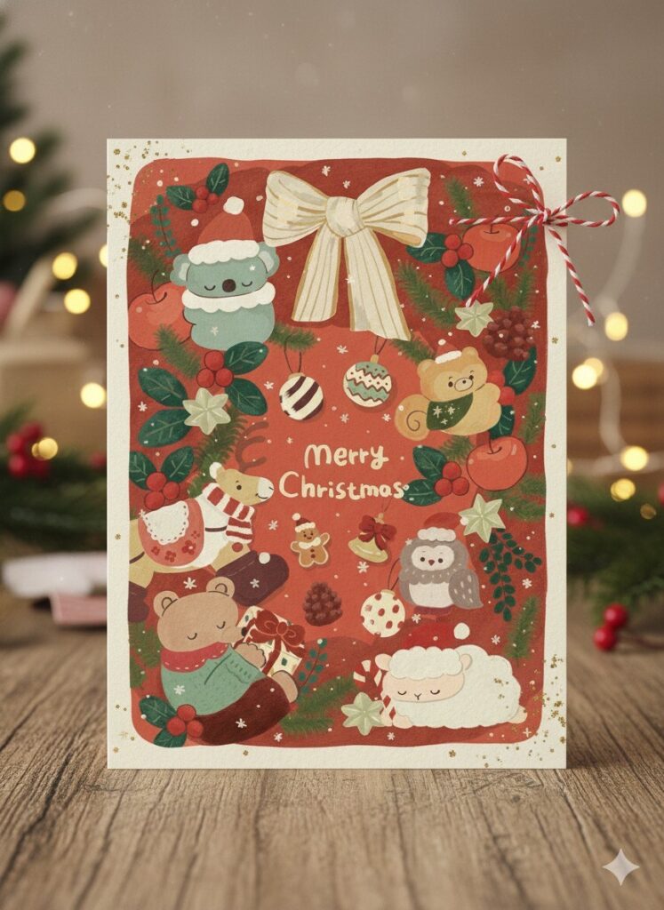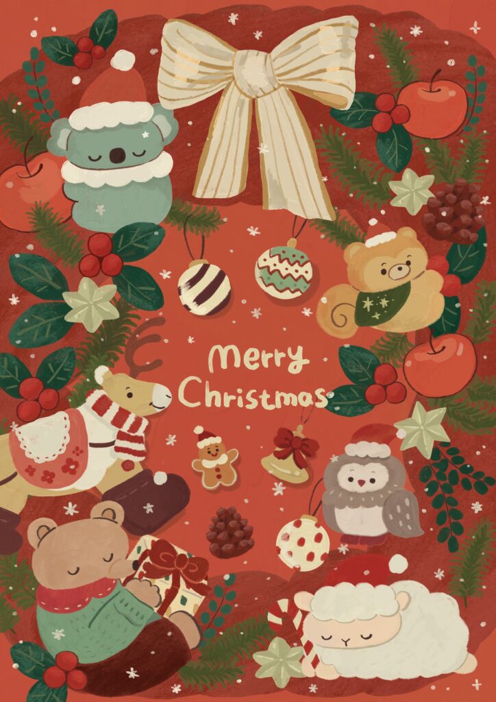 冬季限定のポスターや、クリスマスカードを想定して描きました。リースに集まってクリスマスをお祝いする動物たち。