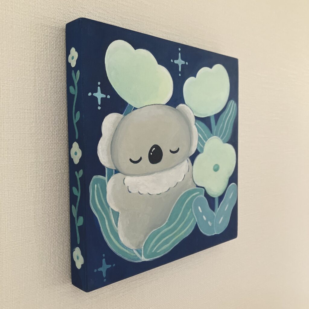 やさしい夜、花に包まれてぐっすりと眠るコアラを描きました。